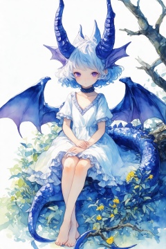 watercolor \(medium\), 1girl, solo, sitting, dress, short hair, looking at viewer, short sleeves, purple eyes, flower, frills, puffy sleeves, plant, white dress, horns, expressionless, white background, puffy short sleeves, closed mouth, head wings, bangs, white hair, frilled dress, yellow flower, feet out of frame, tree, blue hair, simple background, frilled sleeves, hands on lap, swept bangs, choker, breasts, leaf, painting, blue theme, dragon horns, v arms, small breasts, bare legs, outdoors, head fins, dragon girl, blue eyes, hand between legs, wavy hair, animal ears, between legs, parted bangs, wings, branch