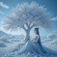 Masterpiece, source_anime, very dramatic angle, portrait of a beautiful and stunning woman sitting under a stunning silver tree on top of a lone hill, woman wearing silver and blue long sleeve fantasy outfit, fields of shimmering silver fantasy crops in the backgrounds, shimmering sky, blue sun, very light blue grass, blue hair, very long hair, intricate hairstyle, lipstick, eyeliner, eye shadow, high-res, semi realistic, best quality, intricate details, ultra details, good lighting, vibrant colors, very detailed, octane render, ray tracing, <lora:极品超模V8_2.0:0.8>