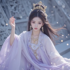 inspired by dunhuang art, ethereal woman in traditional chinese attire, tang dynasty, flowing white and lavender robes, intricate gold headdress, delicate jewelry, dunhuang, serene expression, graceful pose, soft natural light, intricate stone carvings in the background, soft and ethereal mood, full-body shot, slight tilt angle.<lora:极品超模V8_2.0:0.8>