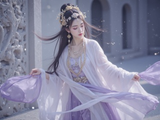 inspired by dunhuang art, ethereal woman in traditional chinese attire, tang dynasty, flowing white and lavender robes, intricate gold headdress, delicate jewelry, dunhuang, serene expression, graceful pose, soft natural light, intricate stone carvings in the background, soft and ethereal mood, full-body shot, slight tilt angle<lora:极品超模V8_2.0:0.8>