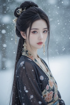 1girl,solo,black hair,hair ornament,long sleeves,floor-length skirt,jewelry,closed mouth,standing,earrings,outdoors,Tang Dynasty courtesans,wide sleeves,narrative photography,hair bun,blurry,makeup,blurry background,floral print,snow,snowing,winter,updo,cover art,high quality,<lora:极品超模V8_2.0:0.8>