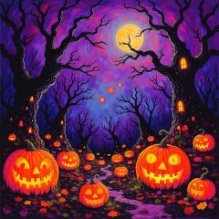 Pumpkin patch in enchanted forest at midnight, thick paint layers, saturated orange and purple colors, magical environment, glowing jack-o'-lanterns, dreamlike quality, paint dripping effect, ethereal feeling,chromaflow