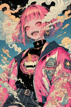 1girl, solo, earrings, jewelry, jacket, pink hair, short hair, smoke, looking at viewer, pink eyes, teeth, shirt, black shirt, bangs, clenched teeth, open clothes, upper body, open jacket, skirt, long sleeves, cloud, from below, fangs, turtleneck, star (symbol), pink jacket, sky, blunt bangs