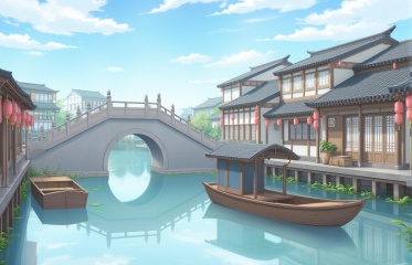 guo_feng_chang_jing,A serene scene of a traditional Japanese village with wooden houses,bridges over calm waters and boats docked along an old canal. a small boat is floating on a body of water. The boat has a brown roof and a blue door. To the left of the boat,a gray bridge stretches over the water's edge. The bridge is adorned with red lanterns,creating a peaceful and serene atmosphere. The sky is a light blue,dotted with white clouds. Digital painting,