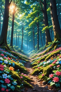 This vibrant, digital illustration depicts a fantastical, serene forest scene bathed in ethereal light. The forest is filled with tall, slender trees with trunks that are dark brown and slightly textured. The trees are densely packed, their leaves a vibrant green, creating a lush canopy above. Sunlight filters through the foliage, casting a soft, glowing effect on the forest floor. The ground is covered in a lush, green moss, interspersed with a vibrant carpet of flowers., suprn1j1
