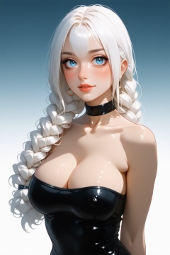 This is a digital illustration in an anime-inspired art style, featuring a voluptuous woman with a striking appearance. She has a light skin tone and striking, voluminous white hair styled in a loose, wavy braid cascading over her shoulder. Her eyes are large, bright blue, and she has a slightly flushed, youthful face with a confident expression, suprn1j1