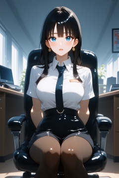 This is a digital illustration in an anime style, featuring a young woman sitting in an office chair. The woman has long, straight black hair with bangs that cover her forehead, and her skin is a fair complexion. She has large, expressive blue eyes and a slightly flushed face, suggesting a mix of embarrassment or surprise, suprn1j1