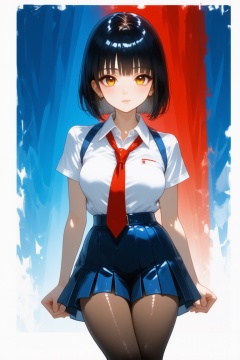 The image is a vibrant, high-quality digital illustration in the anime style, featuring a young woman in a provocative schoolgirl outfit. She has a petite build with a fair skin tone and short, bob-cut black hair with bangs. Her eyes are strikingly large and golden, giving her an alluring appearance. She wears a white short-sleeved blouse with a red necktie, a blue pleated skirt, and black thigh-high stockings, suprn1j1