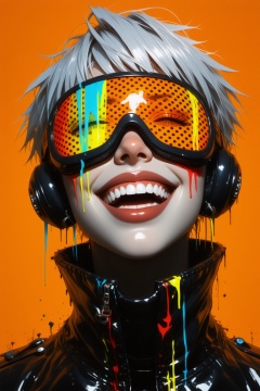 The character's expression is wide-eyed and joyful, with a broad smile showing their teeth. Their lips are painted a glossy black, and they have a few small, black lines or marks on their cheeks, adding to the edgy, cyberpunk aesthetic.