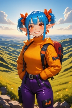 This image is a digital illustration in a vibrant, anime-inspired style. The subject is a young female elf with olive-green skin, large pointed ears, and striking blue hair styled into two high pigtails with orange bows. She has expressive, large red eyes with a mischievous sparkle and a smile. Her face is adorned with a few freckles and a slight blush on her cheeks, adding to her playful demeanor.