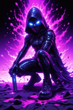This is a vibrant digital artwork featuring a dynamic, futuristic character. The central figure is a humanoid with a sleek, black, form-fitting suit adorned with metallic white and silver accents. The suit has a hooded cape that billows out behind, adding a sense of movement and depth. The character's face is obscured by a glowing, ethereal mask that emits a bright, neon blue light, giving it a mysterious and otherworldly appearance. The eyes are the only visible part of the mask, adding an intense, almost menacing expression. The figure is crouching down with one arm thrust forward toward the viewer.