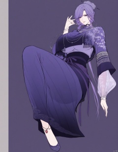 solo,highly detailed,(best quality),((masterpiece)),1girl,simple background,looking at viewer,an,full body,purple hair,large breasts,long sleeves,(sitting),necklace,bracelet,silver jewelry,updo,