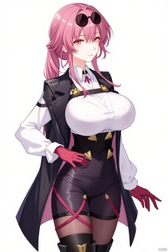 1girl, solo, long hair, breasts, looking at viewer, bangs, skirt, large breasts, shirt, gloves, long sleeves, closed mouth, standing, jacket, full body, white shirt, ponytail, pink hair, pantyhose, sidelocks, boots, collared shirt, pink eyes, black footwear, coat, thigh boots, sunglasses, eyewear on head, jacket on shoulders