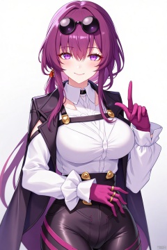 1girl, solo, long hair, breasts, looking at viewer, smile, bangs, shirt, gloves, long sleeves, hair between eyes, jewelry, purple eyes, jacket, white shirt, purple hair, earrings, shorts, sunglasses, ring, eyewear on head