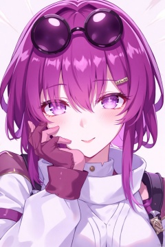 1girl, solo, looking at viewer, smile, bangs, gloves, long sleeves, hair between eyes, purple eyes, white shirt, upper body, purple hair, sunglasses, eyewear on head, hand on own face, hand on own cheek