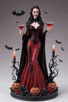 Halloween style, Candle figure, candle style, very exquisite, intricate details, breathtaking art, A high-quality anime-style figure of a stunning Halloween vampire woman, dressed in a sleek, dark red and black vampire gown with lace and velvet accents. Her outfit is elegantly designed, with a fitted bodice, high collar, and flowing cape that adds a sense of drama to her look. She has long, flowing black hair with a slight wave, and her skin is pale, with piercing red eyes that glow mysteriously. Her expression is alluring, with a mischievous, seductive smile that reveals her sharp fangs. She holds a small goblet filled with a glowing red liquid, adding to her vampiric allure. The base is decorated with gothic details, like black roses, twisted vines, and miniature bats, giving a dark and elegant Halloween atmosphere. The overall design blends beauty and mystery, capturing the essence of a seductive vampire queen ready for Halloween night.