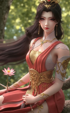 masterpiece,1girl,long hair,(sitting:1.3),chinese clothes,(red dress:1.39),black eyes,beautiful face,short sleeves,holding,holding flower,,hanfu dress,,looking at viewer,(huge breasts:2.59),Xzhaoliner,(Lotus pond, lotus:1.29)