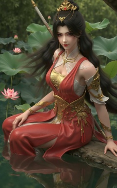 masterpiece,1girl,long hair,(Sitting by the lotus pond in the garden:1.3),chinese clothes,(red dress:1.39),black eyes,beautiful face,short sleeves,holding,holding flower,,hanfu dress,,looking at viewer,(huge breasts:2.59),(full breasts:1.99),Xzhaoliner,(Lotus pond, lotus:1.52)
