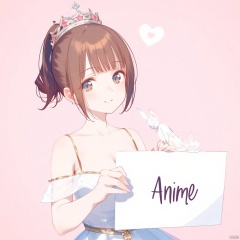 1girl, solo, breasts, looking at viewer, smile, short hair, blue eyes, simple background, brown hair, dress, jewelry, closed mouth, upper body, earrings, hair bun, white dress, lips, single hair bun, pink background, tiara, crown, realistic, princess,,holding a sign. There's a caption on the sign that says, "Anime"