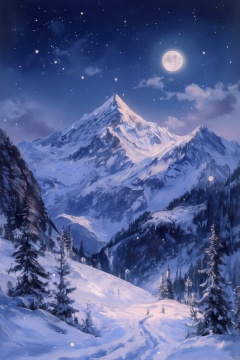 A mesmerizing oil painting of a snow-covered mountain range, bathed in the soft, ethereal light of a full moon. The snow-capped peaks, painted with a variety of whites and grays, stand against a backdrop of a clear, star-studded night sky. The subtle light of the moon creates a magical atmosphere, highlighting the pristine beauty of the landscape. The textures of the snow and the surrounding air are meticulously rendered, capturing the serenity and quietude of a winter wonderland.