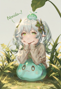 {{{nahida (genshin impact)}}},  twintails, on_head, slime, slimel_on_head, green slime, solo, looking_at_viewer, long_hair, grass,leaf,slime_on_head, head_rest, animal, simple_background, grey_background, :t, long_sleeves, hair_between_eyes, upper_body, grey_shirt, shirt, pout, bangs, closed_mouth, sweater, english_text, best quality,amazing quality,very aesthetic,absurdres,masterpiece,