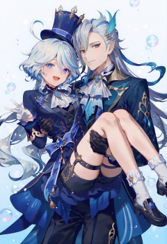 neuvillette_\(genshin_impact\), furina_\(genshin_impact\), 1girl, 1boy, gloves, blue_eyes, long_hair, blue_headwear, blue_hair, hat, black_gloves, carrying, ahoge, looking_at_viewer, multicolored_hair, shorts, smile, open_mouth, ascot, blue_jacket, white_background, pointy_ears, white_hair, streaked_hair, jacket, simple_background, top_hat, long_sleeves, closed_mouth, hair_between_eyes, princess_carry, :d, blue_gemstone, bubble, hair_ornament, black_footwear, socks, short_hair, gem, white_ascot, v, feather_hair_ornament, blue_coat, heterochromia, water_drop, white_socks, blue_bow, thigh_strap, sidelocks, coat, light_blue_hair, black_shorts,, best quality,amazing quality,very aesthetic,absurdres,masterpiece,