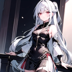 1girl,solo,long hair,breasts,looking at viewer,bangs,red eyes,thighhighs,long sleeves,dress,hair between eyes,bare shoulders,medium breasts,very long hair,closed mouth,standing,ponytail,braid,white hair,cowboy shot,detached sleeves,sleeveless,black dress,sleeveless dress,jing,