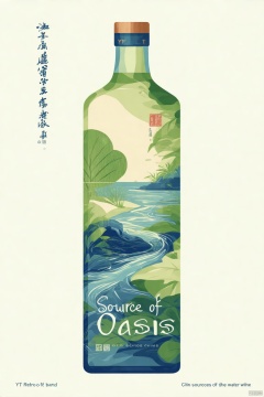 Name of the wine: Source of Oasis. Combining "Oasis" with elements such as oasis and water sources represents the purity and nature of liquor. Green and blue can be used to express oases and water sources, while adding some traditional Chinese cultural elements, such as Chinese characters, seals, etc., to increase the cultural connotation of the brand,Yt retro anime style,This style comes from yt old movies,Vector style