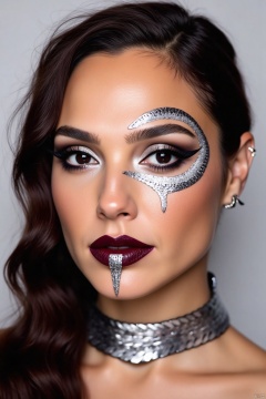 Her hair is long and dark brown, slightly disheveled, with some strands falling over her forehead. She wears a silver, snake-like choker around her neck, which matches the metallic theme of her makeup. The background is plain and neutral, focusing all attention on her face and makeup. The image has a high level of detail, capturing the texture of her skin, the shine of her makeup, and the intricate design of her accessories. The overall style of the makeup is bold, edgy, and artistic, emphasizing a futuristic, gothic aesthetic.,Gal Gadot