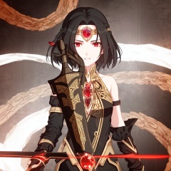 circlet, gem, hair ornament, holding weapon, red eyes, weapon, short hair, sleeveless, black hair, 1girl, solo<lora:姬麟黑:0.8>