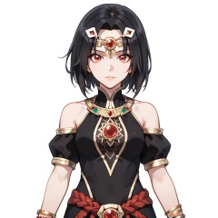 (white background:1.2),looking at viewer,(SOLO:1.4),outline,simple background,upper body, cowboy shot,looking at viewer,(((arms at side))),  jilin hei, jilin, black hair, jewelry, red eyes, hair ornament, bracelet, short hair<lora:姬麟黑-pony:0.8>