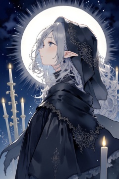 1girl, gray hair,black witch clothes, earrings, pointy ears, elf, veil, moon, night, seraphic Candles, upper body, close-up, looking away, masterpiece, best quality, aesthetic, watercolor,