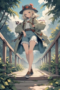 1girl,Standing with one foot on tiptoe, on a wooden bridge,