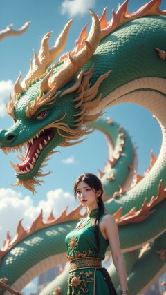 (masterpiece, best quality:1.2),The girl and the Chinese dragon,Chinese dragon,1girl,bare shoulders,black hair,Chinese Hanfu,squama ,The hair on the faucet,Ultimate details,Dragon horn,The graceful and winding dragon body,blue sky,bracelet,Open the dragon's mouth,Close range,Green Dragon,close-up,A dragon hovering in the air,The girl stood in front, wearing a green Hanfu, upper body, looking at the audience,ancient Chinese architecture,breasts,day,The camera looks up from below,dragon,dragon horns,earrings,eastern dragon,jewelry,midriff,navel,outdoors,scales,sky,teeth
