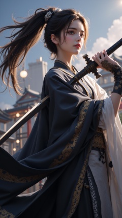 (masterpiece, best quality:1.2),1girl,with black hair,wielding a sword and a long sword,She holds the hilt with her left hand,facing upwards,while touching the sword with her other hand and placing it behind the sword. Her black Hanfu,men's clothing,magic sword,black long sword,uneven surface of the sword,upper body,above buttocks,outdoor,sky,solo,high ponytail,street lamp behind,light bulb,