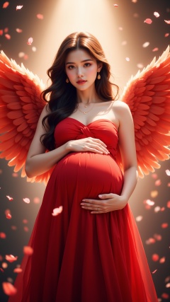 (masterpiece, best quality:1.2),Pregnant mother,Pregnant belly,1girl,angel,Stroking the stomach,Ambient light,Hazy light,glow,Backlight,angel wings,bare shoulders,blurry background,breasts,cleavage,confetti,dress,Red wings,Upper body, above thighs,Big wings,earrings,feathered wings,front,Maternal radiance,halo,jewelry,long hair,looking at viewer,medium breasts,parted lips,petals,red dress,solo,spread wings,strapless,strapless dress,wings