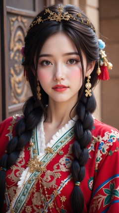 (masterpiece, best quality:1.2),1girl, black hair, braid, brown eyes, building,Chinese architecture ,Tibetan headwear,Tibetan Earrings,Tibetan jewelry,Tibetan girl ,Chinese Tibetan clothing, jewelry, lips, long hair, looking at viewer, solo, twin braids