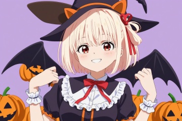 nishikigi chisato,1girl,solo,smile,hair ribbon,looking at viewer,ribbon,Scissorhands,halloween costume,cachinnation,big_tits