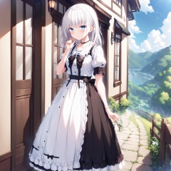 1girl,SHIROHA,outdoors,lolita_fashion,white_hair,wallpaper,high quality,scenery,((normal fingers))