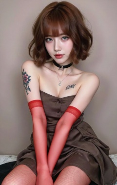 1girl, solo, short hair, bangs, brown hair, blue eyes, collar necklace, strapless, chest tattooed with 老北鼻signature, red stockings, Flower arm tattoo