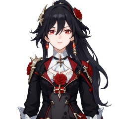 (white background:1.2),looking at viewer,(SOLO:1.4),outline,simple background,upper body, cowboy shot,looking at viewer,(((arms at side))),  fu hua, fu hua bm, long hair, bangs, black hair, hair ornament, red eyes, hair between eyes, flower, hair flower, ponytail, red rose, jewelry, earrings, rosered flower, red flower, rose<lora:xueyue-pony:0.8>