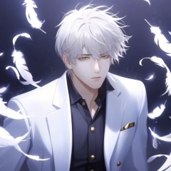 <lora:20241029-1730164497477:0.8>,The image is an illustration of a young man with white hair and a serious expression on his face. He is wearing a white suit with gold buttons and a black shirt underneath. The background is dark and there are white feathers flying around him, creating a sense of movement and energy. The overall mood of the image is dramatic and mysterious.