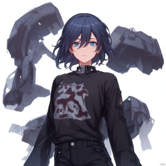 (((arms at side))), t-shirt,blue_eyes,hair_between_eyes,fu hua,white_shirt,(black pants),black legwear,logo on t,logo on shirt,pattern on t,pattern on shirt,hair between eyes