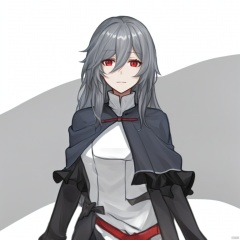(((arms at side))), pleated skirt,red eyes,hair ornament,capelet,very long hair,long sleeves,hair between eyes,grey hair,black skirt,bangs