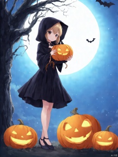 An animated image of a girl in a black dress and a dark hooded cape. The girl is holding a pumpkin in her hands. The pumpkin is orange with a jack-o-lantern on it. There are three pumpkins on the ground in front of the girl. There is a tree on the right and left side of the image. The sky is blue behind the girl and the moon is visible in the top right corner.