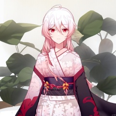 (((arms at side))),hair between eyes,red eyes,pink hair,multicolored hair,short kimono,jewelry,print kimono,very long hair,pink kimono,hair ornament,japanese clothes,white hair,fu hua,long sleeves