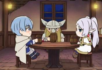 <lora:mofafulilian_ill-xl-000090:1>,1girl, frieren, horned_helmet, pointy_ears, elf, multiple_boys, 2boys, helmet, mole_under_eye, blue_hair, dwarf, twintails, white_capelet, jewelry, sitting, earrings, fake_horns, blue_eyes, green_eyes, mole, long_hair, cup, capelet, mug, brown_footwear, night, armor, pantyhose, boots, horns, holding_cup, holding, black_pantyhose, cape, indoors, beard, short_hair, beer_mug, window, blush, white_hair, white_cape