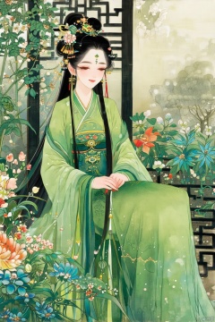 1girl, solo, dress, black hair, hair ornament, chinese clothes, green dress, flower, long sleeves, sitting