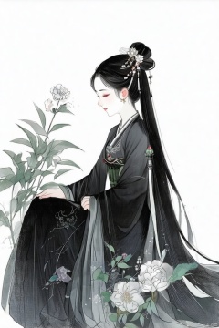 1girl, solo, dress, black hair, hair ornament, chinese clothes, flower, long sleeves, sitting, (sketch, line art:1.3)