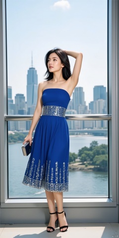 Sexy and noble clothing: a royal blue tube top skirt with silver sequins on the skirt, paired with black strappy high heels and a silver clutch.